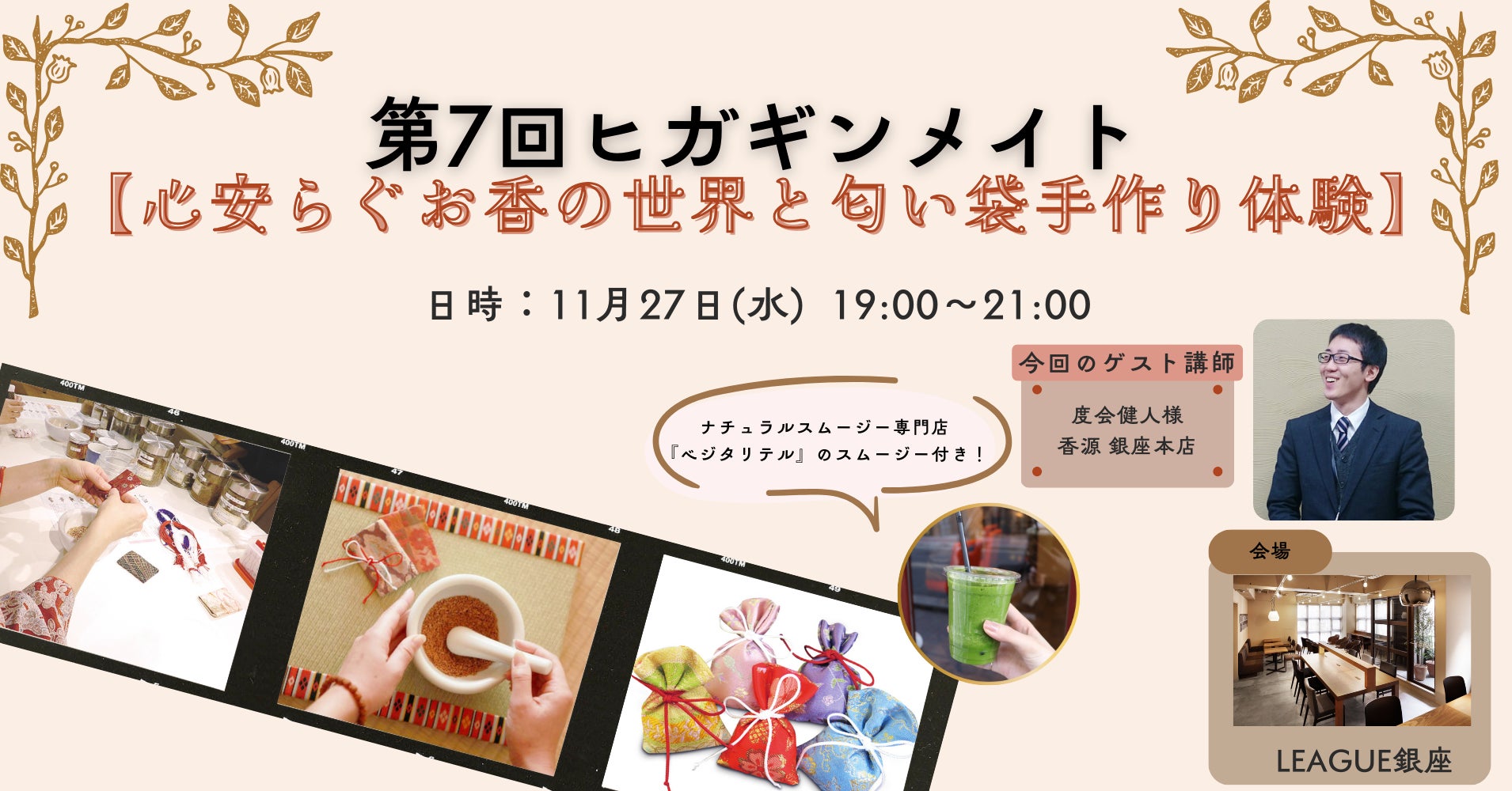 一般社団法人東銀座エリアマネジメントは、東銀座エリアの在住者、在勤者でコミュニティを形成し、幅広い世代 が交流し東銀座への理解を深めるためのイベント『ヒガギンメイト』を定期的に実施中。 今回は「心安らぐお香の世界と匂い袋手作り体験」を開催します。