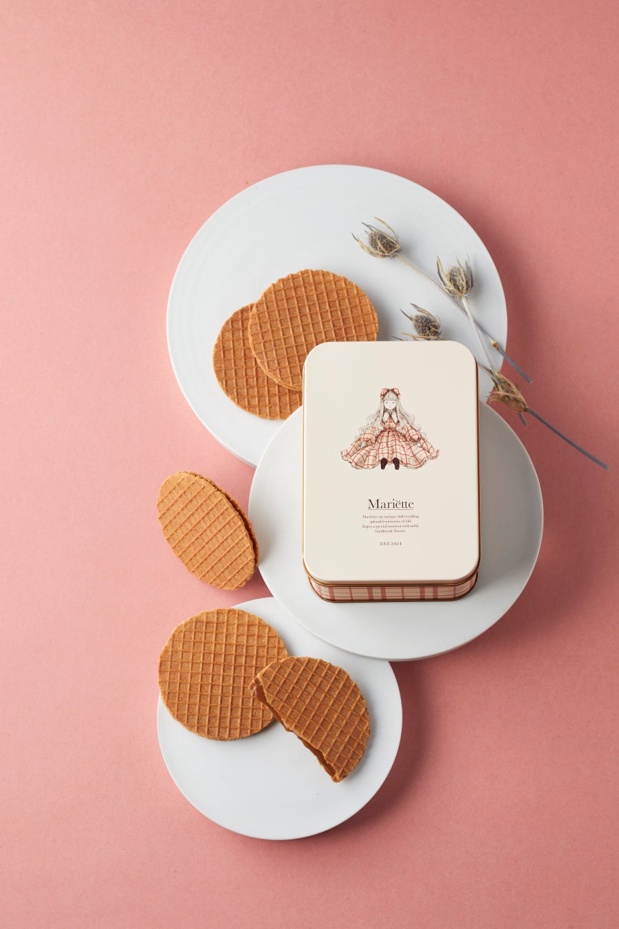 この秋、初お披露目となるブランド<マリエッテ>。可愛らしく温かみのある店舗のデザインやアイテムが特徴の銀座三越限定ブランドです。「ストロープワッフル」などのオランダ菓子を中心に、ヨーロッパ各地のさまざまなお菓子が店頭に並びます。