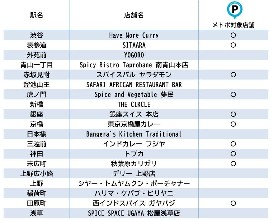 さらにキャンペーン開催期間中、「メトポ会員」のお客様を対象に、メトポ対象店舗(10店舗)でお食事のうえ、店舗に掲示されているQRコードを読み込んでキャンペーンにエントリーいただくと、1店舗あたり50ポイントで、対象10店舗を全て回ると最大500ポイントのメトポを全員に進呈!! 本キャンペーンを機に、まだメトポ会員でないお客様もメトポにご登録いただき、銀座線に乗って、カレーの魅力に触れてみてください!