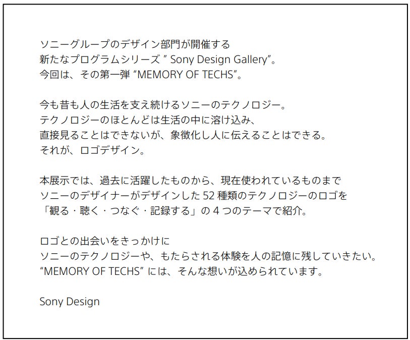 その最初のプログラムとなる「MEMORY OF TECHS」では、「グラフィックデザイン」をテーマに、これまでソニーのデザイナーがデザインしてきたさまざまなテクノロジーロゴを使った体験型展示を開催。