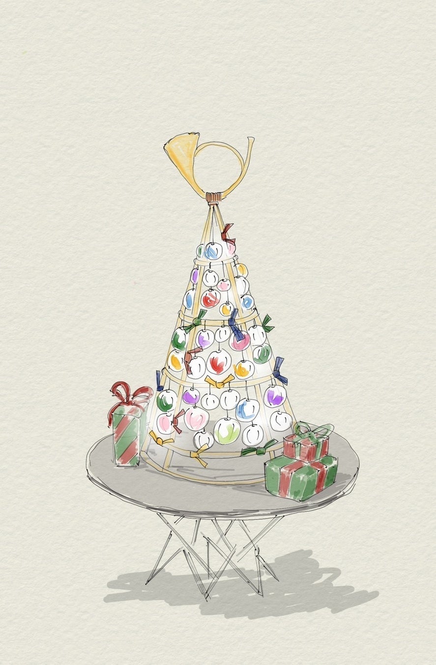 また、日本の伝統工芸や遊びを取り入れた紙風船のオーナメント(エンターテインメント)は、画材店である月光荘の“自己表現を後押ししたい”という想いから、ゲストが自由に絵の具で絵付けできるようにしました。ツリーを見上げると月光荘のトレードマークである「友を呼ぶホルン」がクリスマスツリーのトップスターとしてツリーを華やかに飾ります(ランドスケープ)。ホルンの音のもとに多くの仲間が集まるようにとの願いが込められたこの「友を呼ぶホルン」にちなんだ今回の「友を呼ぶクリスマスツリー」。まさにこのツリーの下に集まる仲間たちが色や音を通じて出会い、交流し、それぞれの個性を反映した作品が集まることにより徐々に完成されていきます。