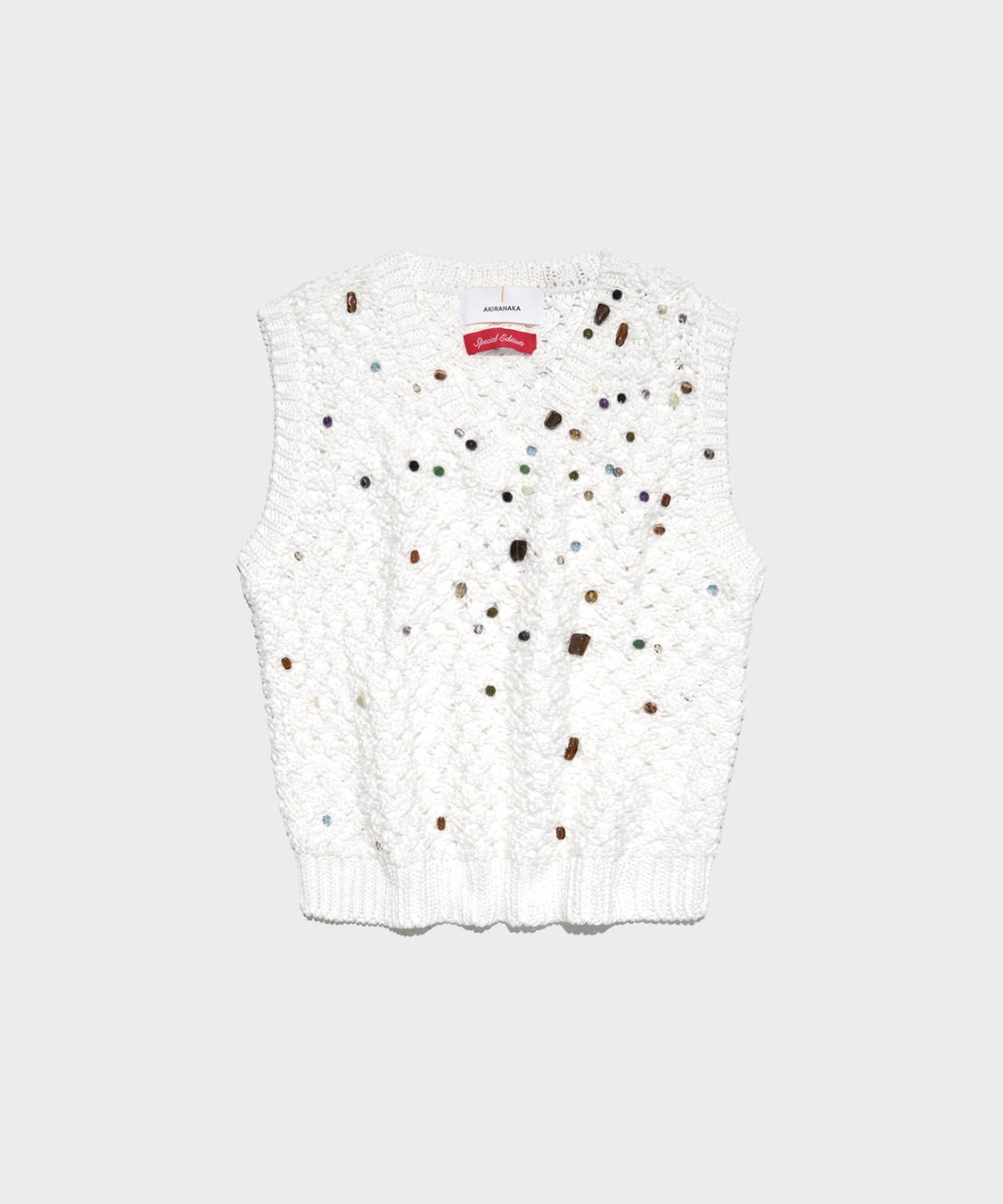 THE TOKYO銀座のオープンを記念して、AKIRANAKA(アキラナカ)との初の完全別注コレクションが実現しました。すべてTHE TOKYOのためだけに一からデザインされた特別なラインナップです。手作業でビジューを施したニットベストは、一点一点ビーズが異なる仕様で、ホワイトは今回が初登場。ジレはブラウスとしても着られる美しいカットワークが特徴で、どんな体型の方にもフィットします。同素材のパンツは程よいフレア感で汎用性抜群。さらに、デザイナー描き下ろしのアートTシャツは、知性と優美さを兼ね備えた唯一無二の仕上がりです。色展開もお客様からのご要望にお応えして豊富に揃えました。