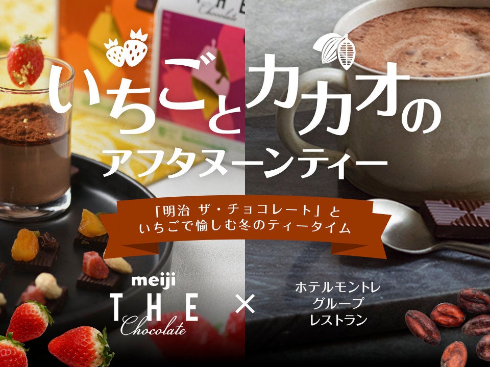ホテルモントレのレストラン(一部)では、いちごのアフタヌーンティーと『明治 ザ・チョコレート』を使ったメニュー、チョコレートドリンクを提供する「いちごとカカオのアフタヌーンティー」を1月25日(木)より予約開始。