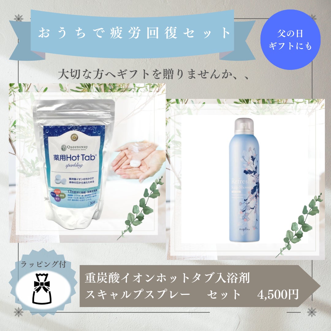 重炭酸イオンホットタブ入浴剤とスキャルプスプレーのセットが4,500円(税込)