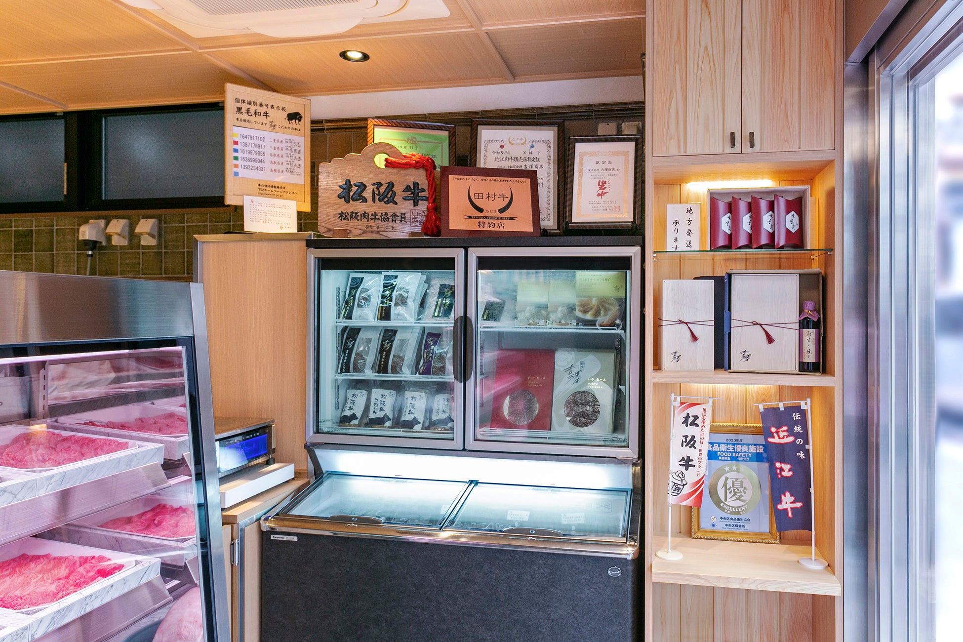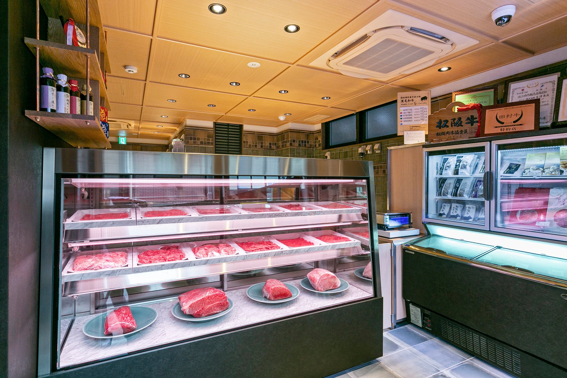 精肉店では目利きが厳選した雌牛のみを一頭買いし販売。血統と飼育法にこだわった受賞歴のある銘柄牛は肉質・脂質ともに最高品質。室内の湿度が保たれ、場所による温度の偏りをなくした大型の水冷式冷蔵庫を構えており、ベストな状態のお肉をショーケースに並べており、外観から骨付き肉を眺めることができる追熟用の冷蔵ショーケースも完備している。