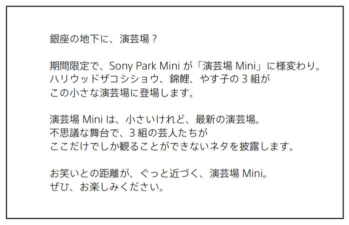 10坪の実験的POP-UPスペースSony Park Mini(ソニーパークミニ)は「お笑い」をテーマとしたプログラムを開催中。「お笑い」をテーマに、Sony Park Minが演芸場になった。ソニーの空間再現ディスプレイを活用したデジタルステージに、ソニー・ミュージックアーティスツに所属する旬のお笑い芸人「ハリウッドザコシショウ」「錦鯉」「やす子」の3組が3D(立体)で登場。普段のテレビや舞台とは違う想定外の角度からもお客さまに見られてしまうという、3組の芸人としても初めての体験となる演芸場で、実験的なお笑いステージが楽しめる。「演芸場 Mini」は2024年1月16日(火)~2月5日(月)まで。