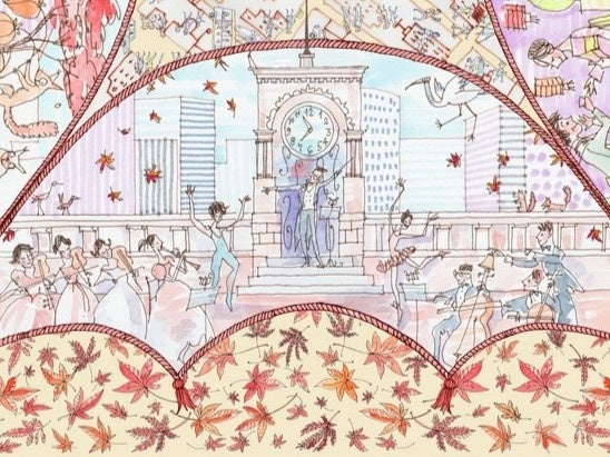 右側には、紅葉舞う秋風の中でオーケストラが音楽を奏で、バレエダンサーが踊る様子が。銀座のシンボルである時計塔の上でコンサートを開いたら……というパオロさんの想像が、楽しげな情景で表現されています。