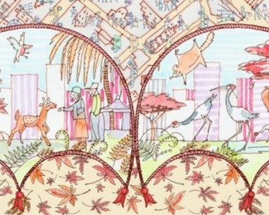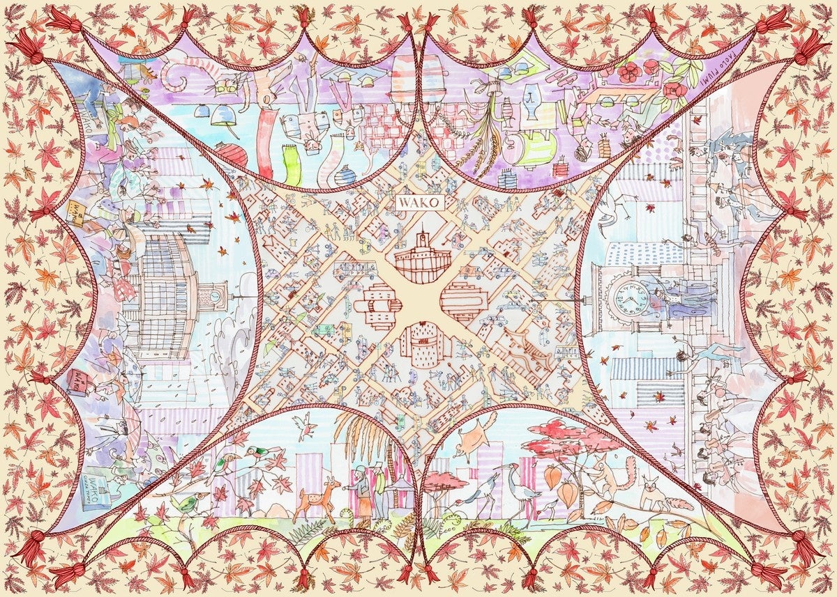 秋の風景に、鹿や鶴といった動物たちが描かれているのも印象的。このほか、彼が持つ⽇本のイメージとして、伝統的なお祭りやお茶会、五穀豊穣をイメージした稲穂なども盛り込まれています。