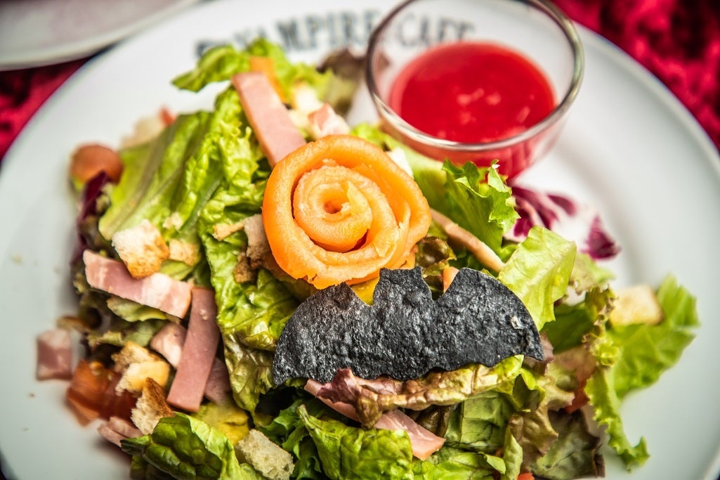 誕生のきっかけは伯爵の閃きだったと伝わり、今やこの館を訪れるほぼ全てのお客人がオーダーするという、違うことなきレジェンドサラダ。伯爵以下館の住人とともに呪文を唱え、血の如く赤いドレッシングを注がねば、死した野菜は復活=美味しくならないので、儀式には心して臨まれますよう…。