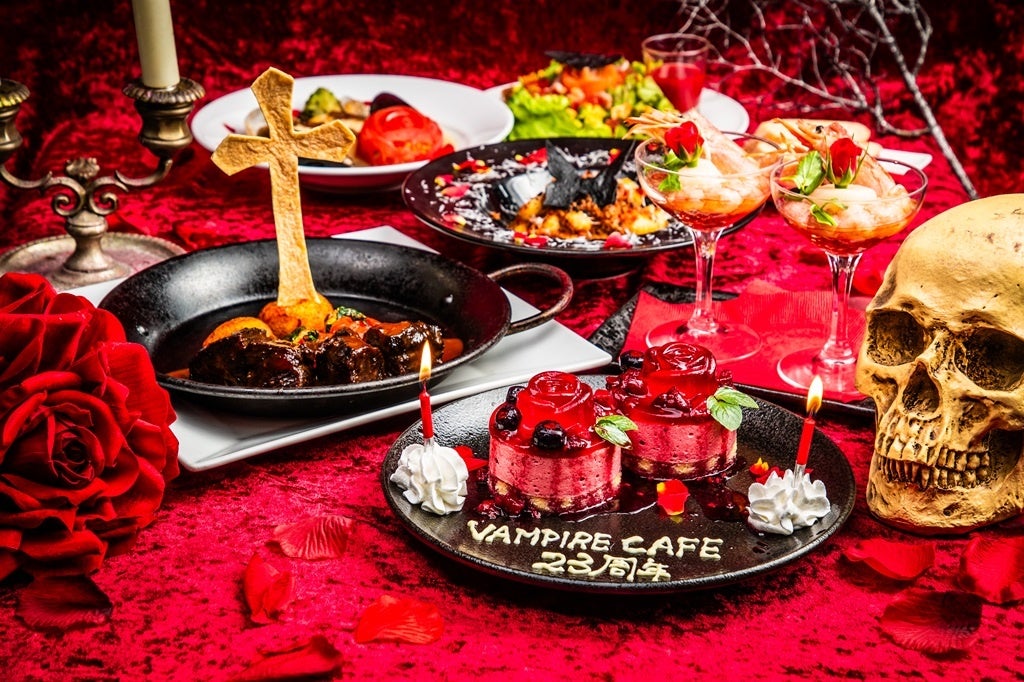 『銀座レストラン VAMPIRE CAFE(ヴァンパイア カフェ)』は、2024年6月、オープン23周年を迎えます。これを記念して、6月1日(土)~6月30日(日)までの1か月限定で、「VAMPIRE CAFE 23周年晩餐会コース」及び、オリジナルグッズ付のスペシャルカクテル「アニバーサリーブラッド」を展開いたします。
