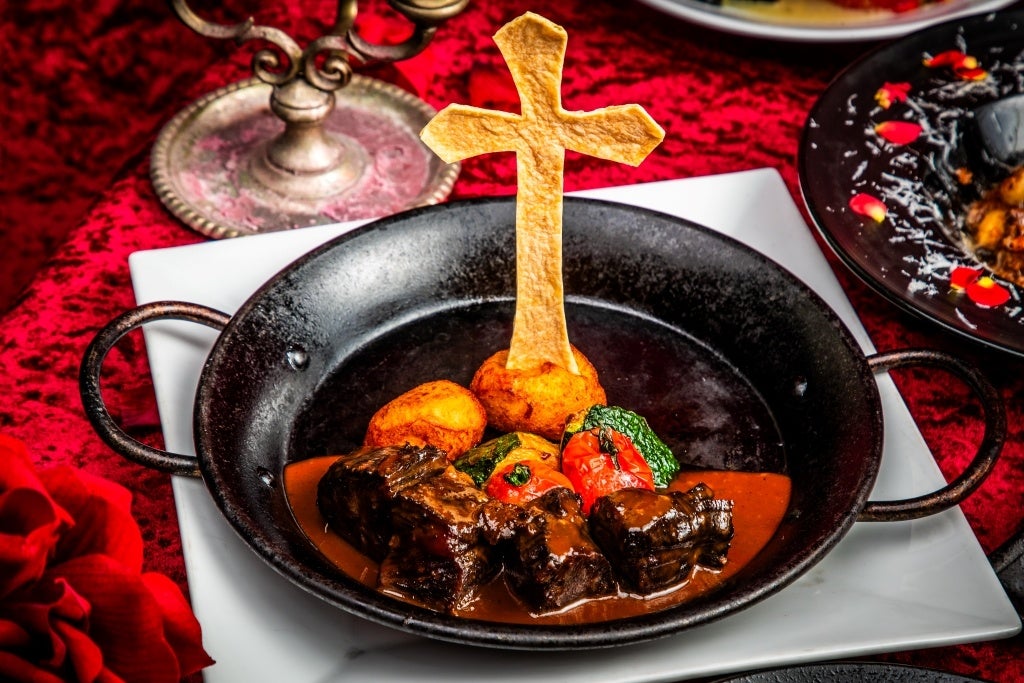 呪文で血塗れるサラダや、火炙りに処される肉料理など、名物勢揃いのフルコース &ローズ伯爵監修オリジナルカクテルのオーダーでオリジナルグッズもプレゼント!