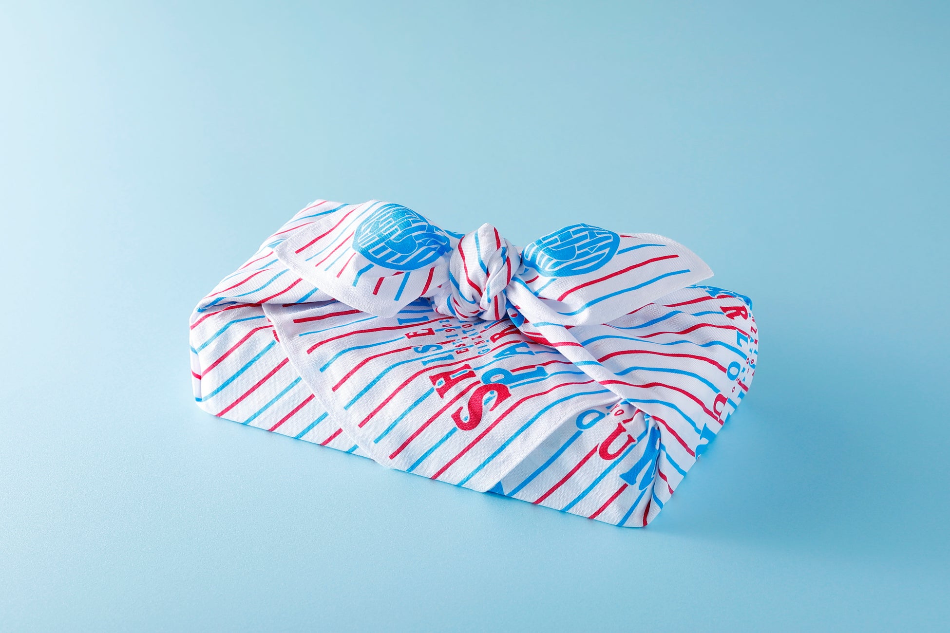 青と赤のストライプが印象的な資生堂パーラーオリジナル風呂敷。