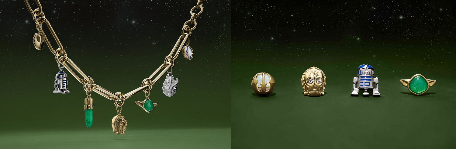 さらに、ヨーダ、R2-D2、C-3POなどの人気キャラクターとアイコンをセミ3Dシルエットとシグネチャークラフトマンシップでデザインしたスター・ウォーズx フォッシルの限定ジュエリーコレクションで、フォースを身近に感じることができます。ゴールドトーンのチャームネックレス(14,300円)、チャームブレスレット(19,250円)、スタッズピアスセット(14,300円)は、グリーンアベンチュリンと繊細な輝きが特徴で、ピアス(9,900円)は反乱軍のエンブレムを表現しています。シルバートーンのネックレス(13,200円)には、R2-D2™をイメージしたデザインのIDプレートとブラッシュ仕上げのセカンドプレートが、ゴールドトーンのネックレス(13,200円)には、C-3PO™をイメージしたデザインのプレートとハンマー仕上げのセカンドプレートが、それぞれ刻印されています。
