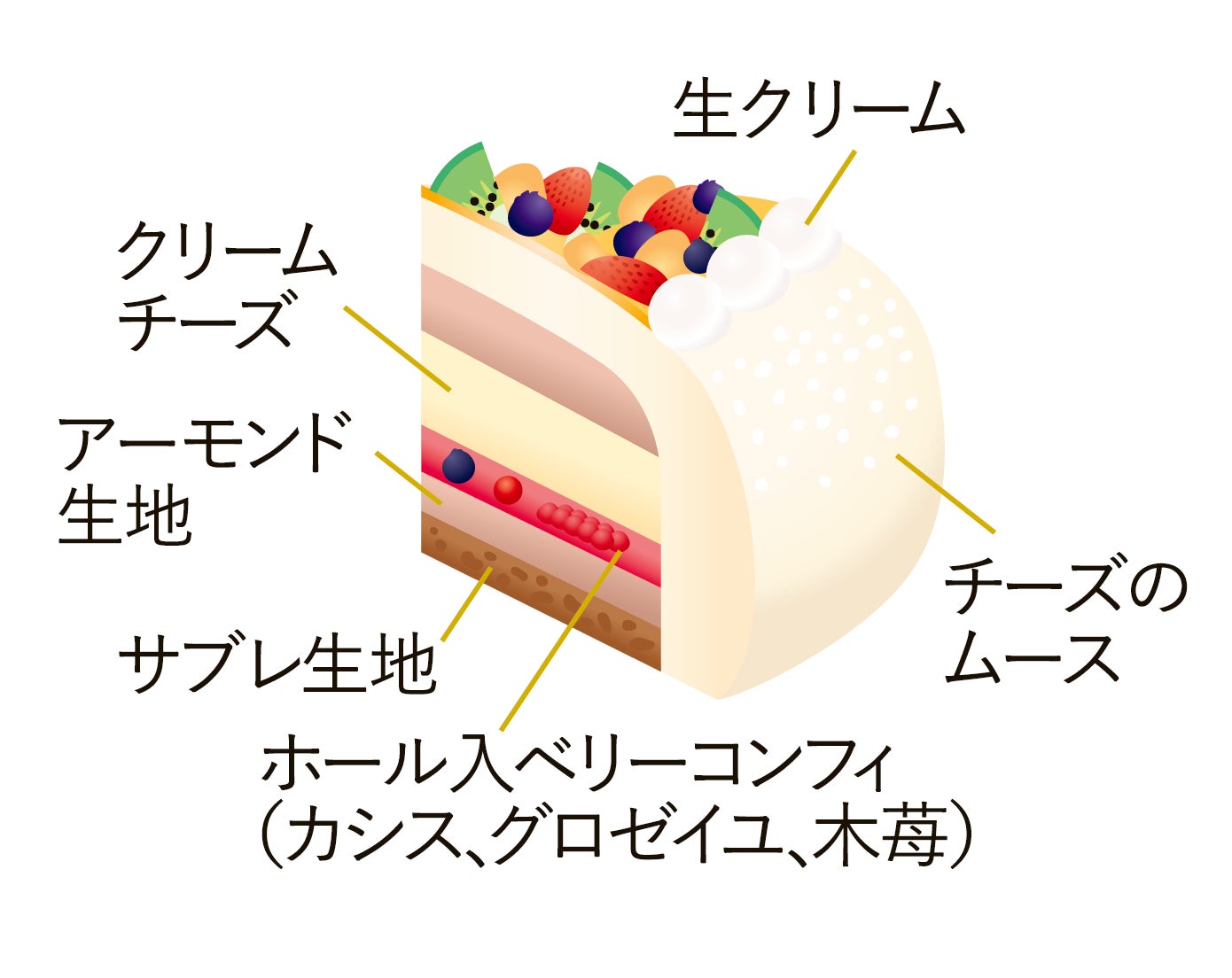 ふんわりと口溶けのよいチーズムースに、爽やかな酸味のベリーのコンフィがアクセント。色とりどりのフルーツデコレーションが華やかです。◎冷凍配送のみ承ります。