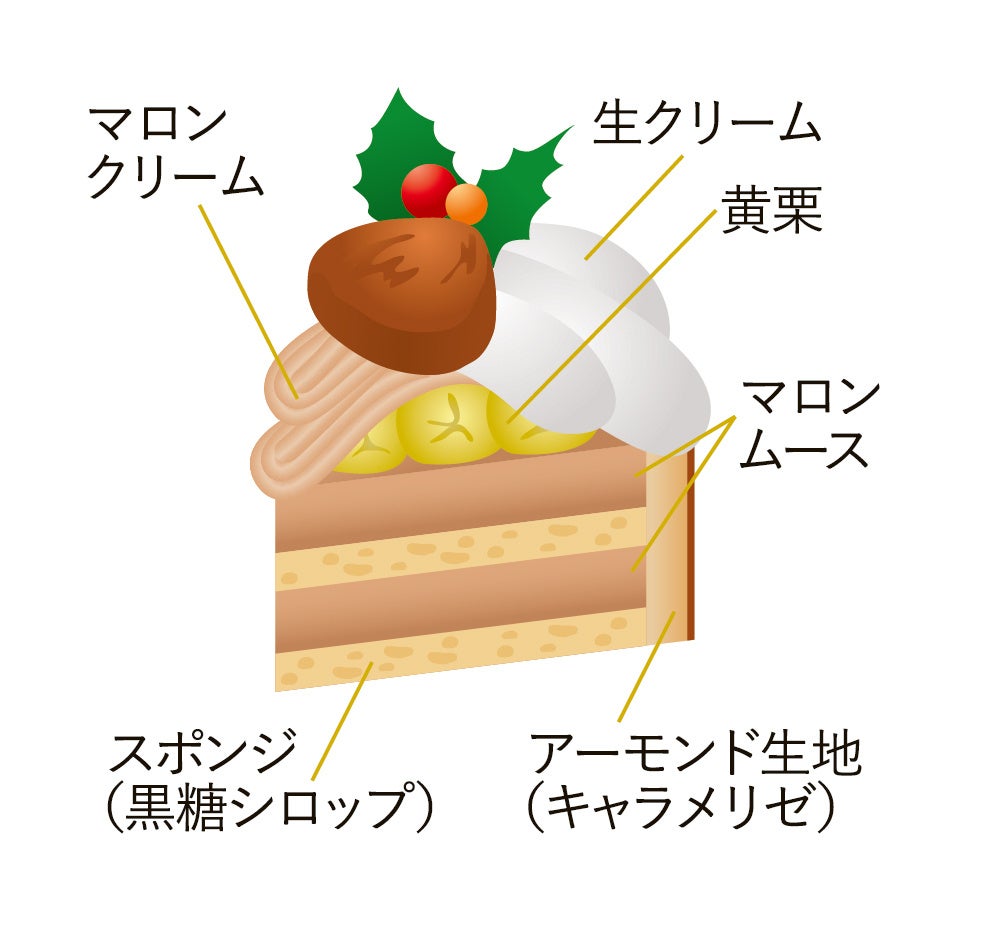 黒糖シロップをふったスポンジ生地にマロンムースを閉じ込め、黄栗とマロンクリームを飾りました。栗好きにはたまらない栗尽くしのケーキです。