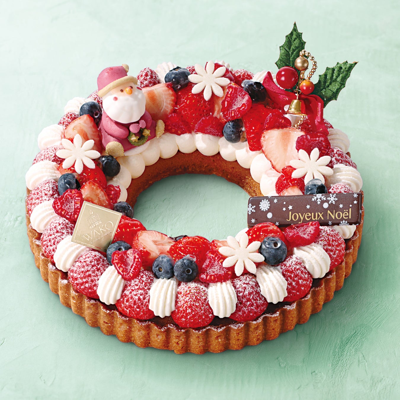 大きめのアーモンドタルトの上に生クリーム、イチゴ、ブルーベリーなどを飾りました。かわいらしいリース形でクリスマス気分を盛り上げてくれます。