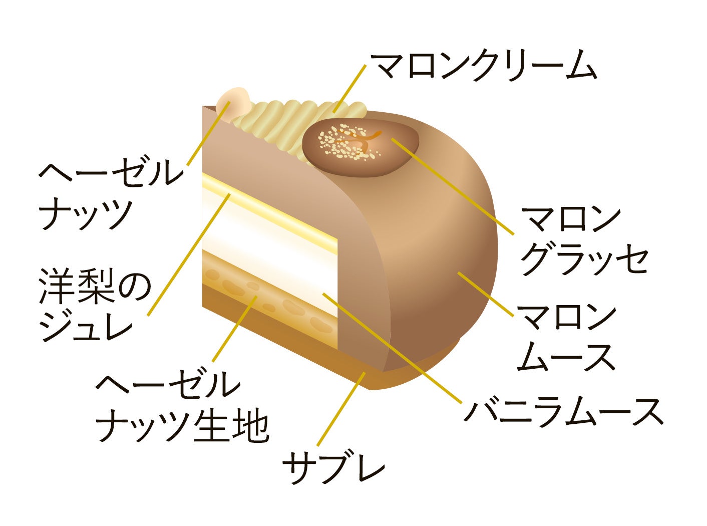サクサクとしたサブレの上に、ヘーゼルナッツ生地、バニラムースと洋梨のジュレを重ね、マロンのムースで包みました。◎冷凍配送のみ承ります。