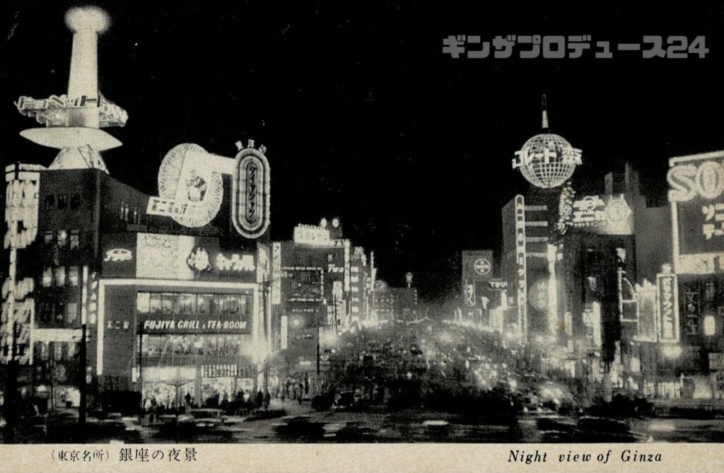 通りの両側に立ち並ぶ百貨店や飲食店、娯楽施設のネオンサインが、まるで競い合うように輝いている。昼間の端正な表情とは異なり、夜の銀座は「日本一の繁華街」としての顔を全面に押し出していた時代だ。