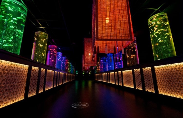 江戸時代から続く金魚鑑賞という文化を、芸術作品「アートアクアリウム」として表現。様々な金魚が優雅に泳ぐ水槽作品を、光彩と音楽、香りで演出し、幻想的な空間が広がります。