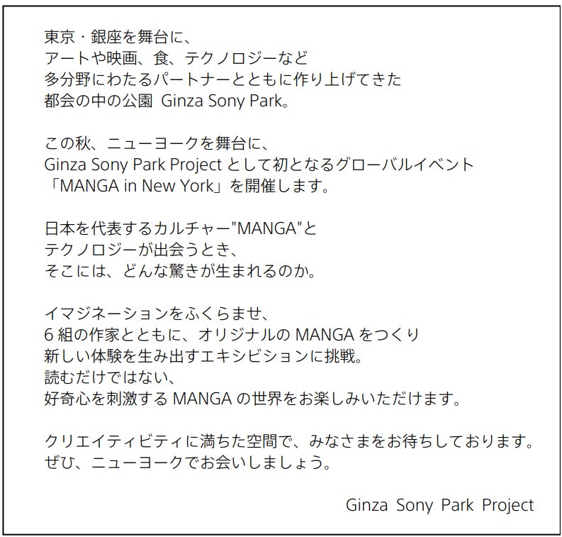 Web:https://www.sonypark.com/ginza/mangainnewyork/(日本語)