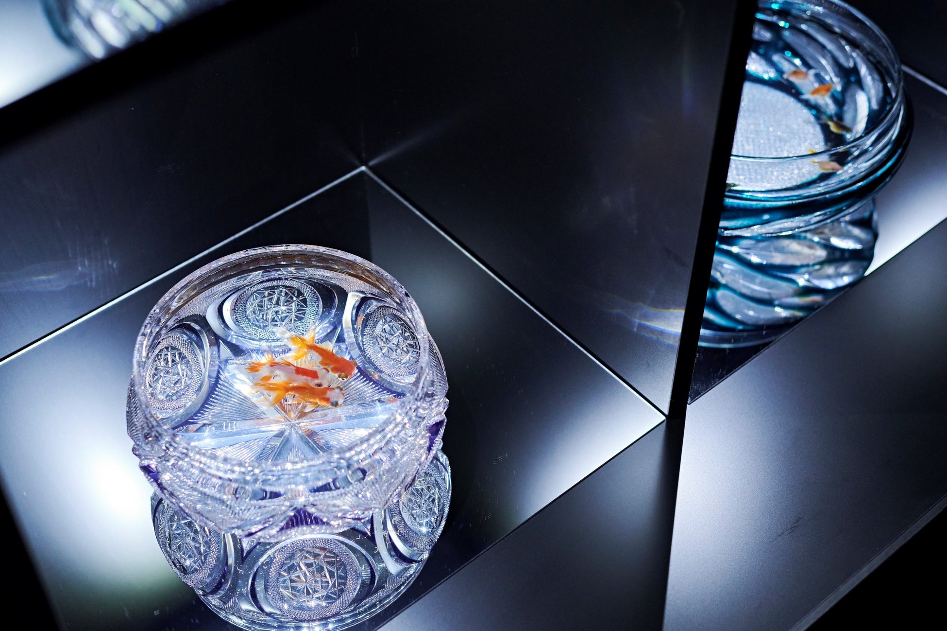 当館展示作品「金魚の飾り棚」では、小型の桶サイズの江戸切子の中を金魚が泳ぎ、その姿を上から眺め鑑賞することができます。江戸切子も江戸時代から続く日本の伝統工芸。江戸をルーツにもつ二つの文化の融合をお楽しみいただけます。