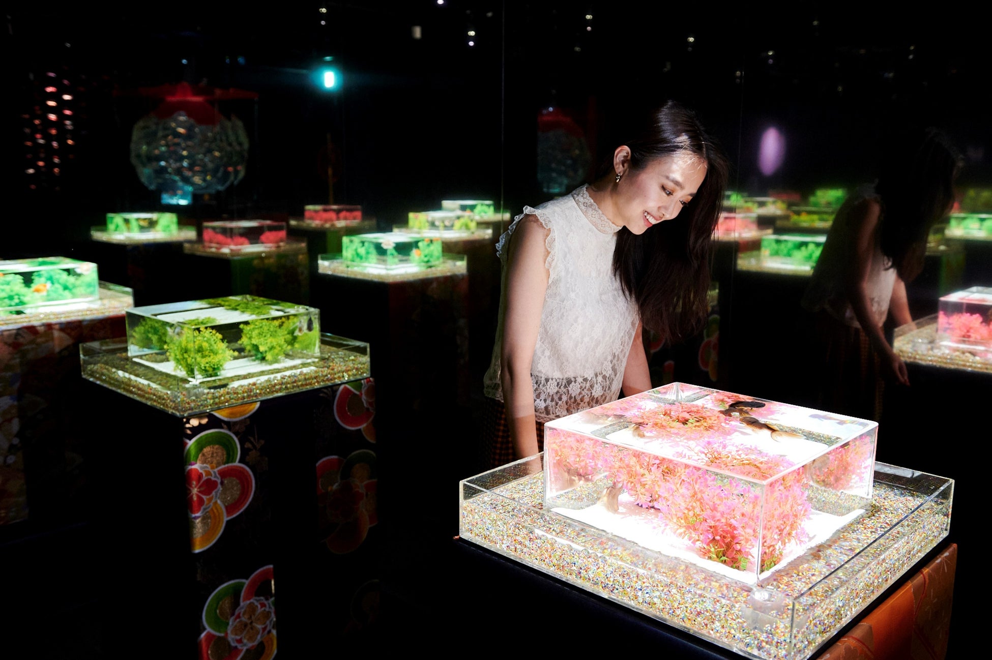 「新金魚品評」も、金魚を上から鑑賞する“上見(うわみ)”ができる水槽作品。上から見ることで金魚それぞれの個性をより鮮明に鑑賞することができるため、いまでも金魚の品評会では金魚を上から見て評価することもあるそう。ここでは24基の水槽作品が並び、個性あふれる24種類の金魚が優雅に泳ぎます。