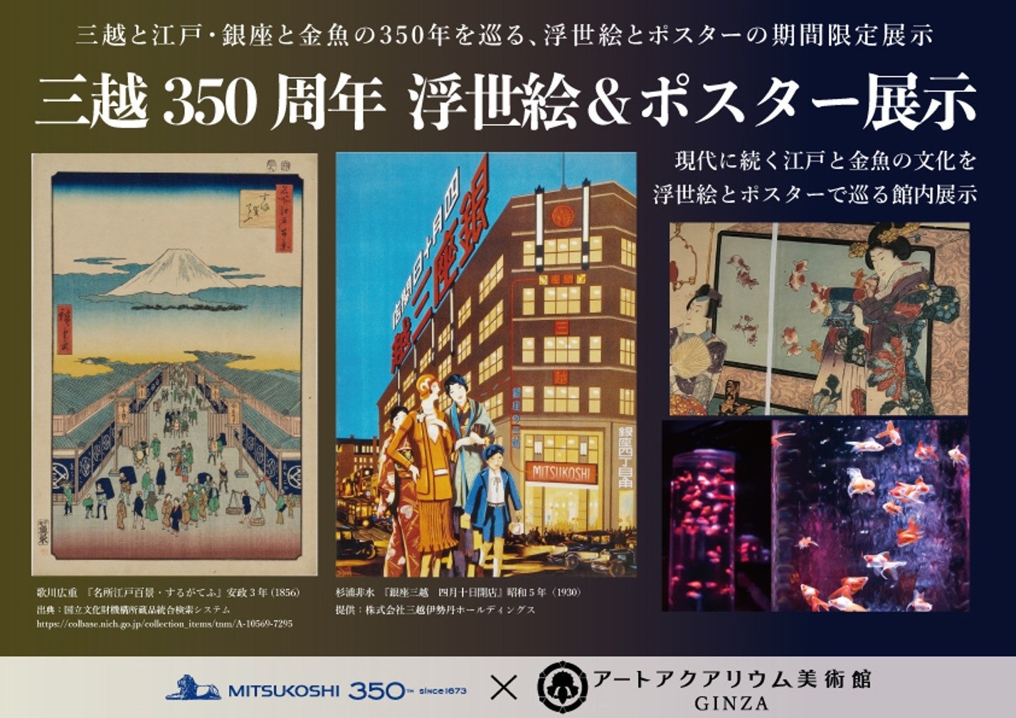 アートアクアリウム美術館 GINZA(所在地/銀座三越)が館を構える三越は、2023年に創業350周年を迎えました。これを記念し、アートアクアリウム美術館 GINZAの館内では、現在「浮世絵×金魚×銀座」と題した特別パネルを展示中です。特別パネルでは、三越が誕生した当時の日本橋の風景や、江戸時代の金魚鑑賞風景、さらに昭和5年に開業した銀座三越開業時のハイカラな風景、そして現在の銀座三越の姿を並べ、移り変わる姿を表現しています。(館内浮世絵展示コーナーにて掲出中)