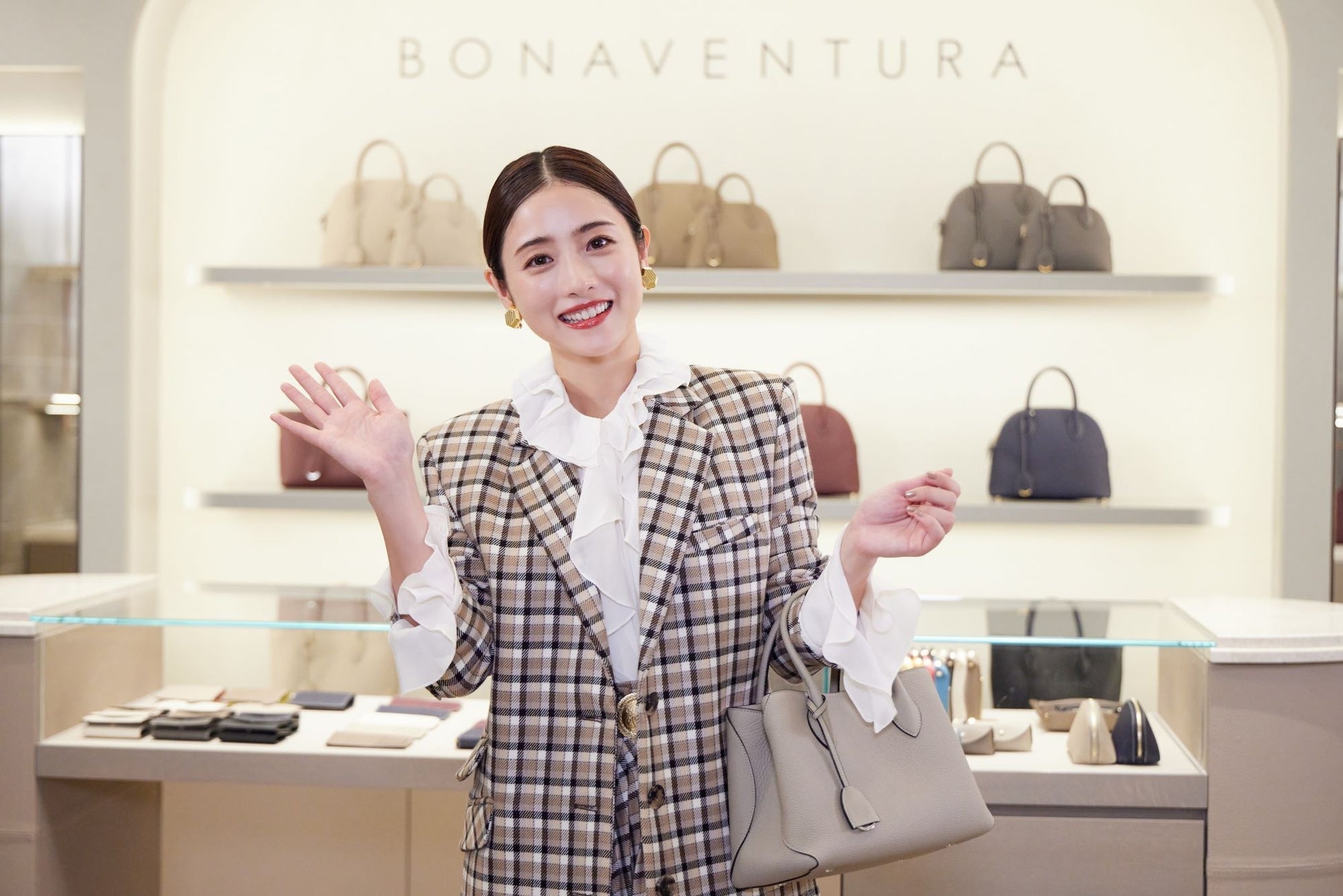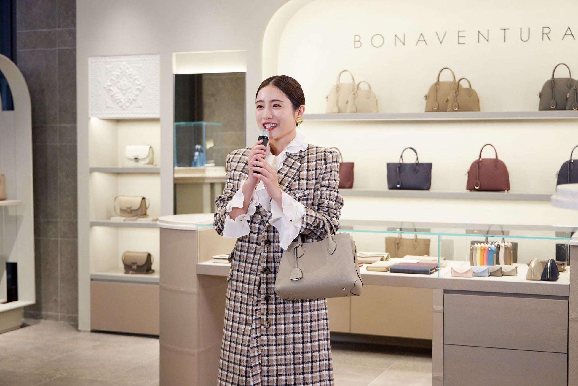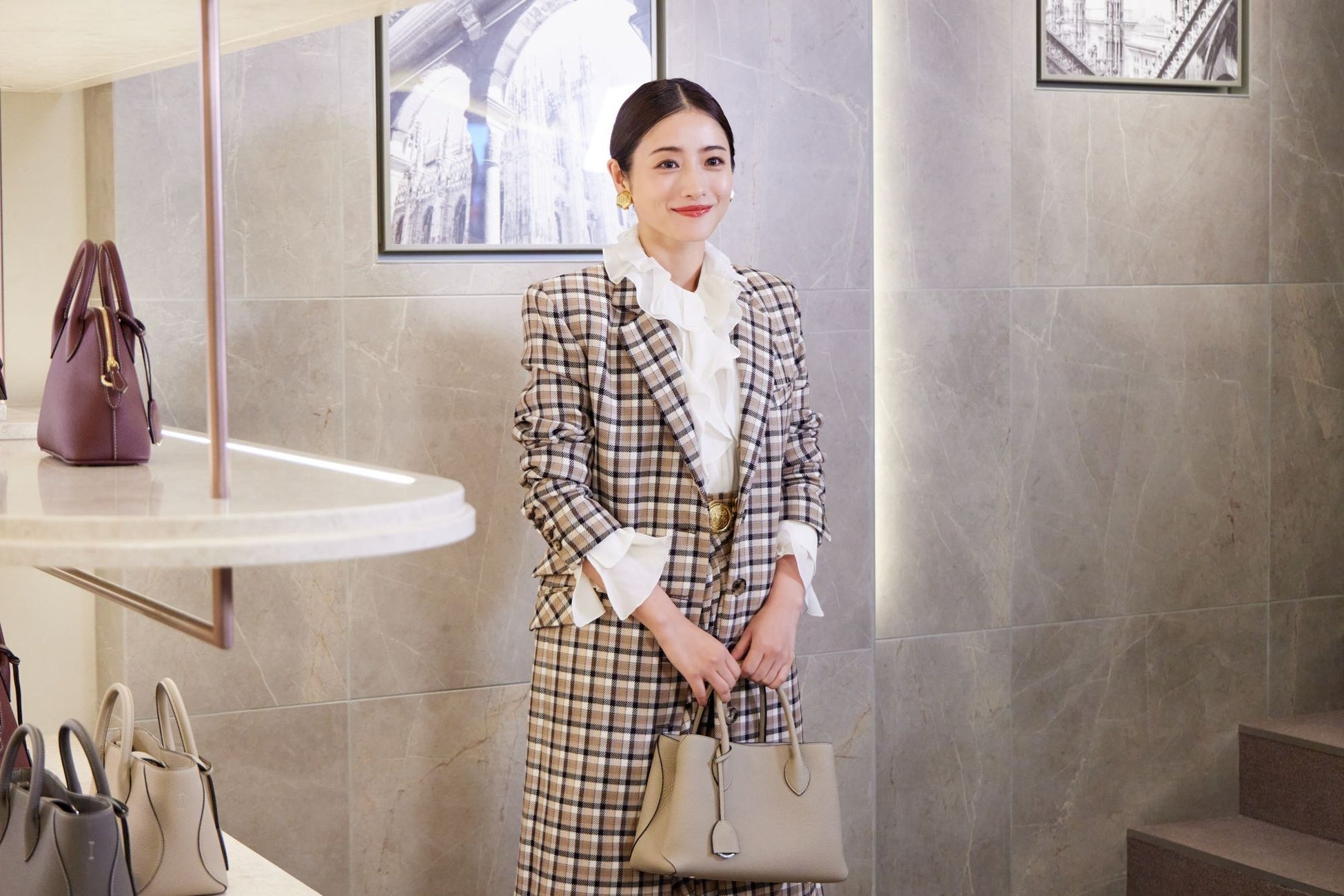 柔らかなベージュのチェック柄ジャケットにあわせた、当ブランドのシグネチャーバッグである「ミア トートバッグ (25 スモール)」を持って報道陣の前で笑顔を見せた。