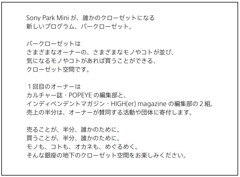 10坪の実験的POP-UPスペース Sony Park Mini(ソニーパークミニ)がクローゼット空間になり、オーナーが持ち寄ったモノやコトを買えるプログラムシリーズ『パークローゼット』を開催中です。