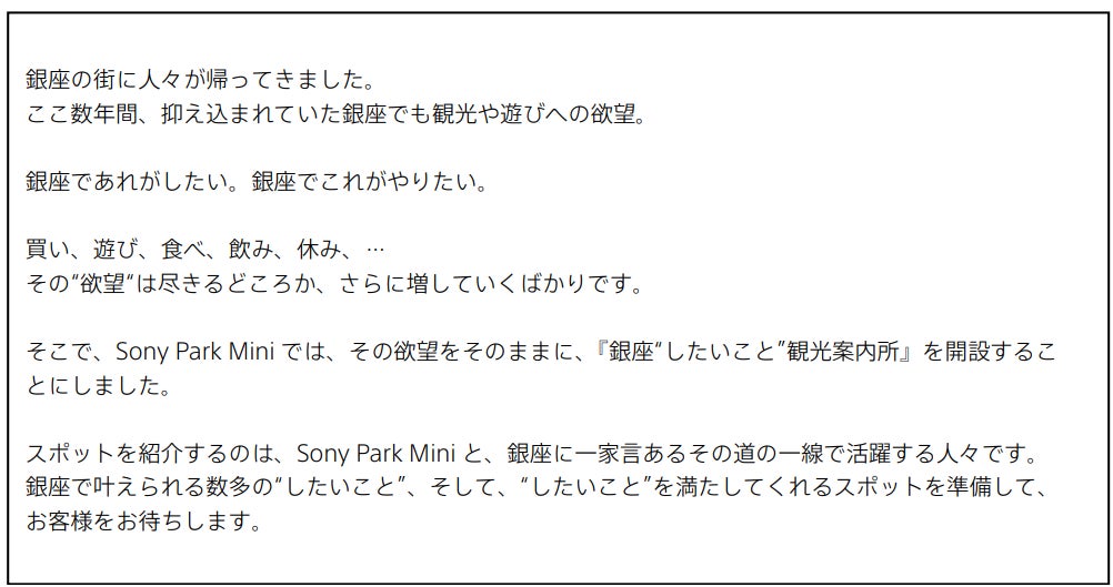 期間中も追加される “したいこと“ と、それを満たす100以上のスポットが詰まった「銀座“したいこと”観光案内リスト」は、Sony Park Miniと公式WEBサイトで公開します。