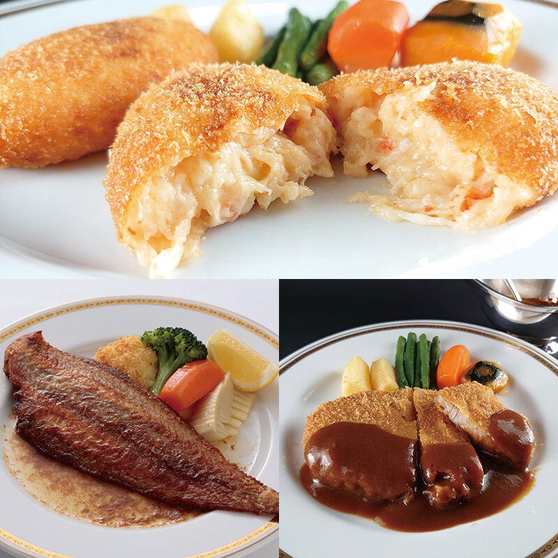 かにクロケット、舌平目のムニエル、ポークカツレツの人気3種を詰合せ。