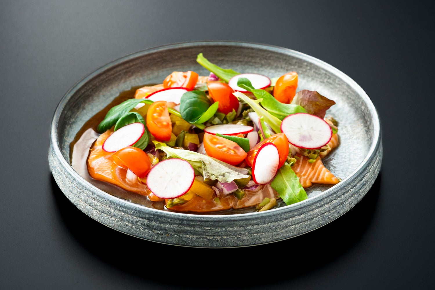 当店自慢の新鮮な生サーモンを贅沢に使用し、特製ドレッシングで仕上げた一皿。サーモンの濃厚な旨みと爽やかな味わいをお楽しみください。