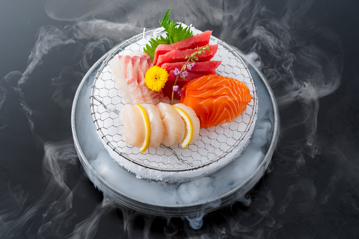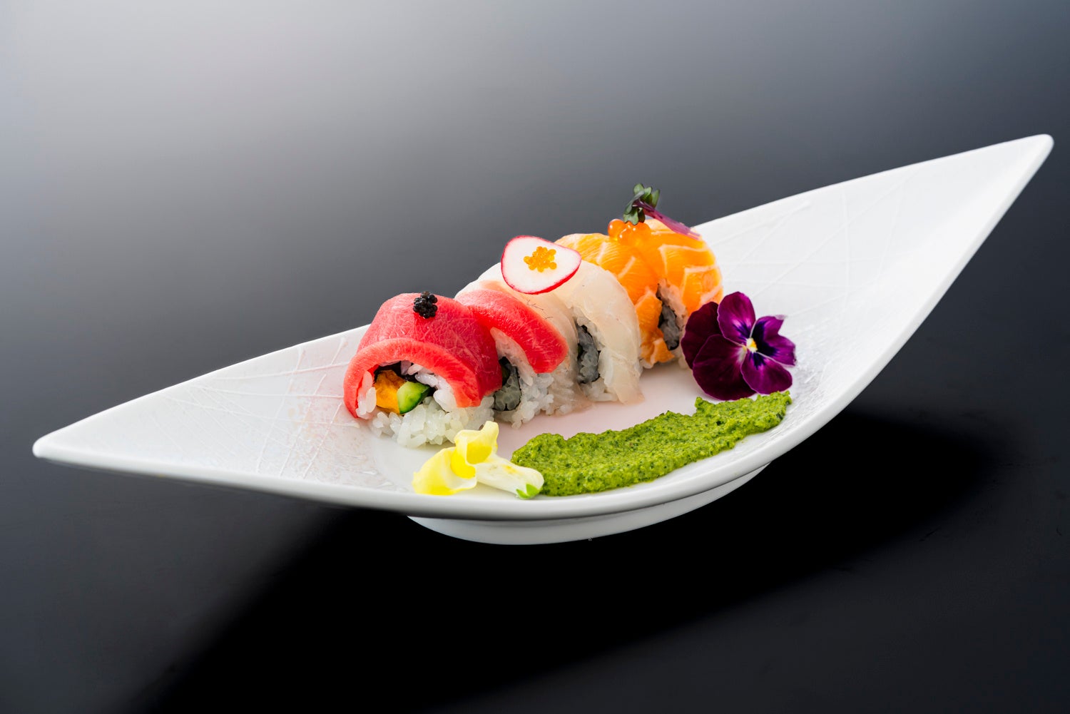 新鮮な海の幸を贅沢に使用した彩り豊かなロール寿司。魚介の旨みが詰まった一品を、ミントを使用した特製のサルサヴェルデソースとともにお楽しみください。