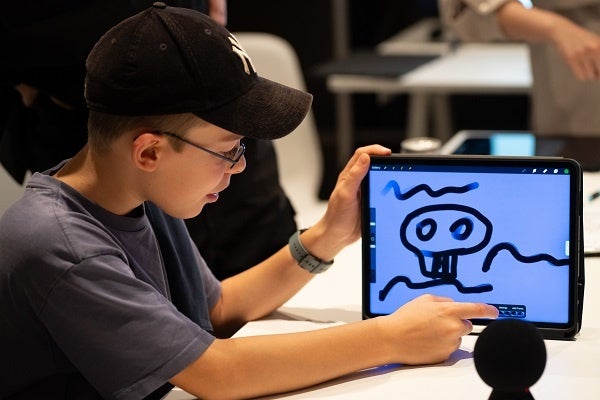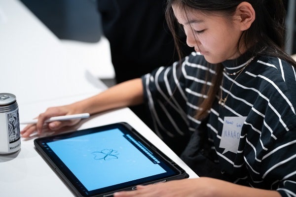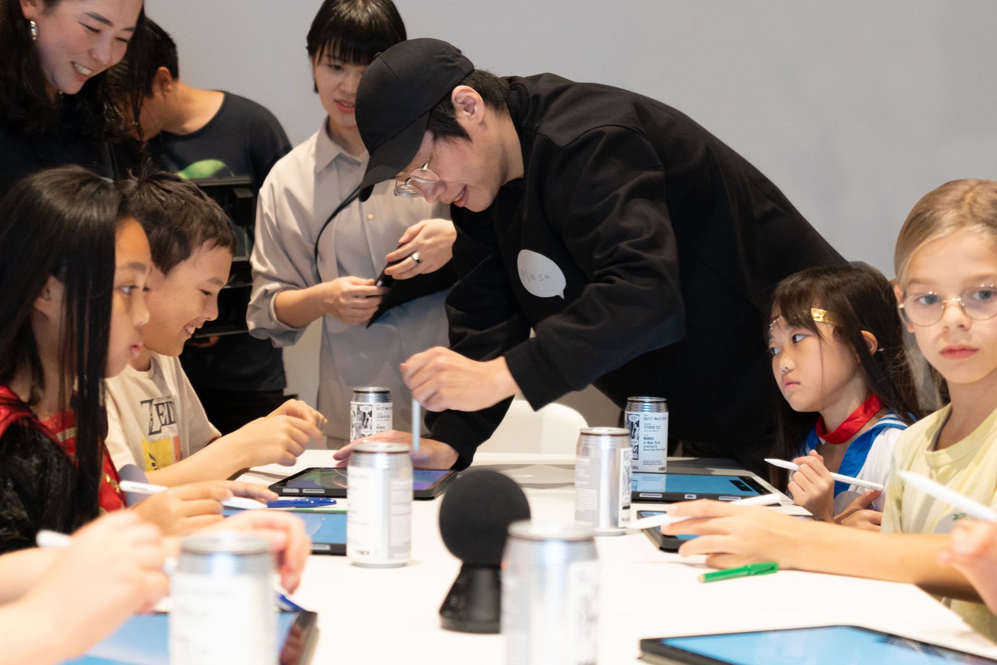 会期中、本エキシビションにも参加しているディレクター/アニメーターの平岡政展による、子ども向けのアニメーション制作体験ワークショップ「絵つなぎアニメーションワークショップ」を開催しました。参加した子どもたちが平岡氏のデモンストレーションに目を輝かせている姿や、集中して作品制作に取り組む姿はとても印象的で、子どもたちからは「初めてアニメーションにトライしたから最初は上手にできるかわからなかったけど、思ったよりも上手にできて楽しかった」「すごく楽しかった。もっと描きたい!」といった声が寄せられました。