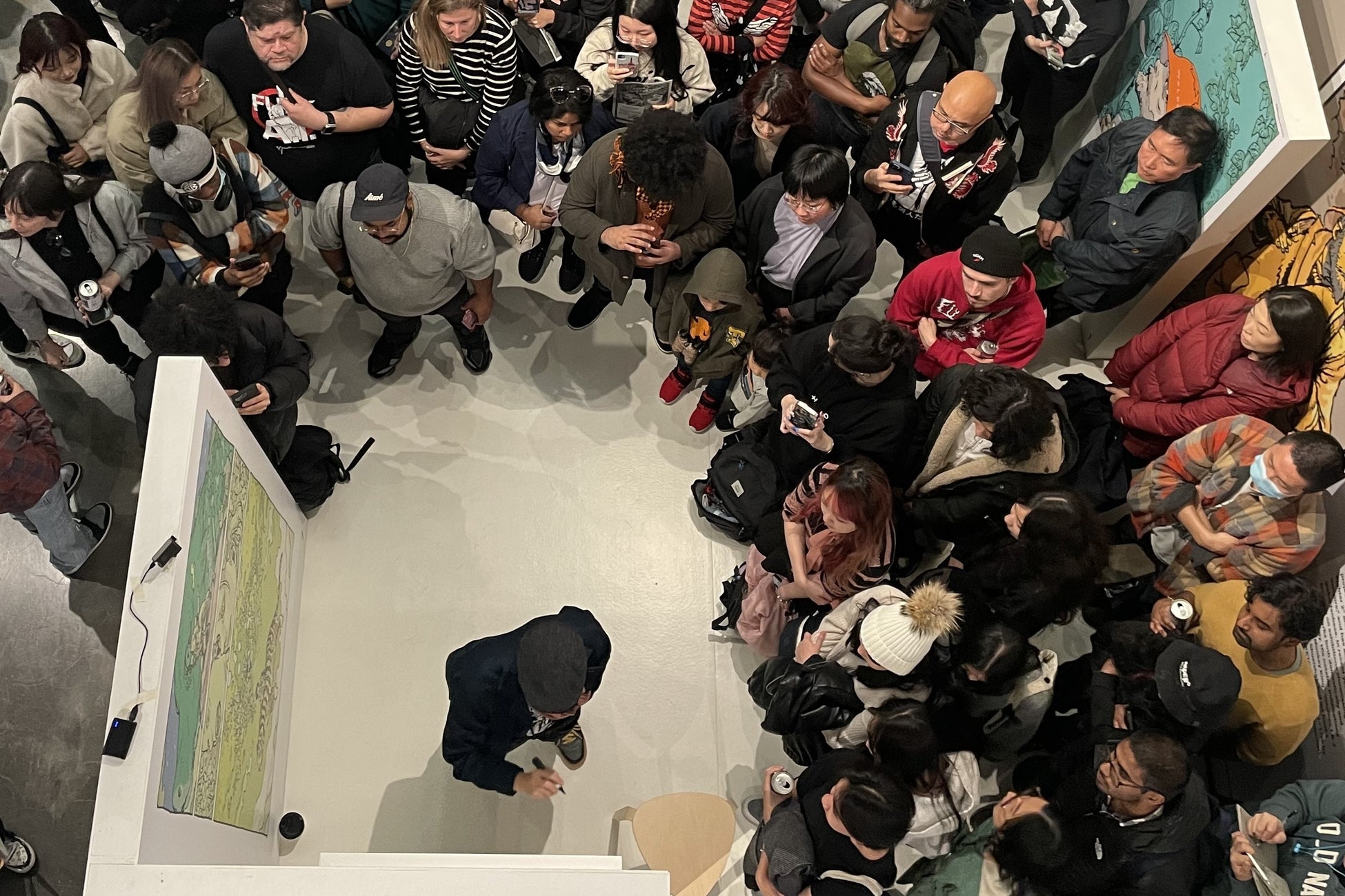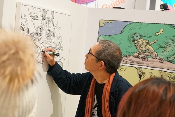 また、同じく今回のエキシビションに参加している、世界的に活躍するイラストレーターであり漫画家の寺田克也によるライブドローイング「Katsuya Terada Live Drawing」では、寺田氏による公開制作が行われました。当日は、会場を訪れた方々が寺田氏を囲むようにして、少しずつできあがっていく作品を息をのんで見つめていました。ドローイング終了後には、寺田氏とのコミュニケーションの場も設けられ、観客からは「ニューヨークで寺田さんのライブドローイングが見れるとは思っていなかったので本当に嬉しいです!」「感動的なライブドローイングでした」といった声が上がっていました。