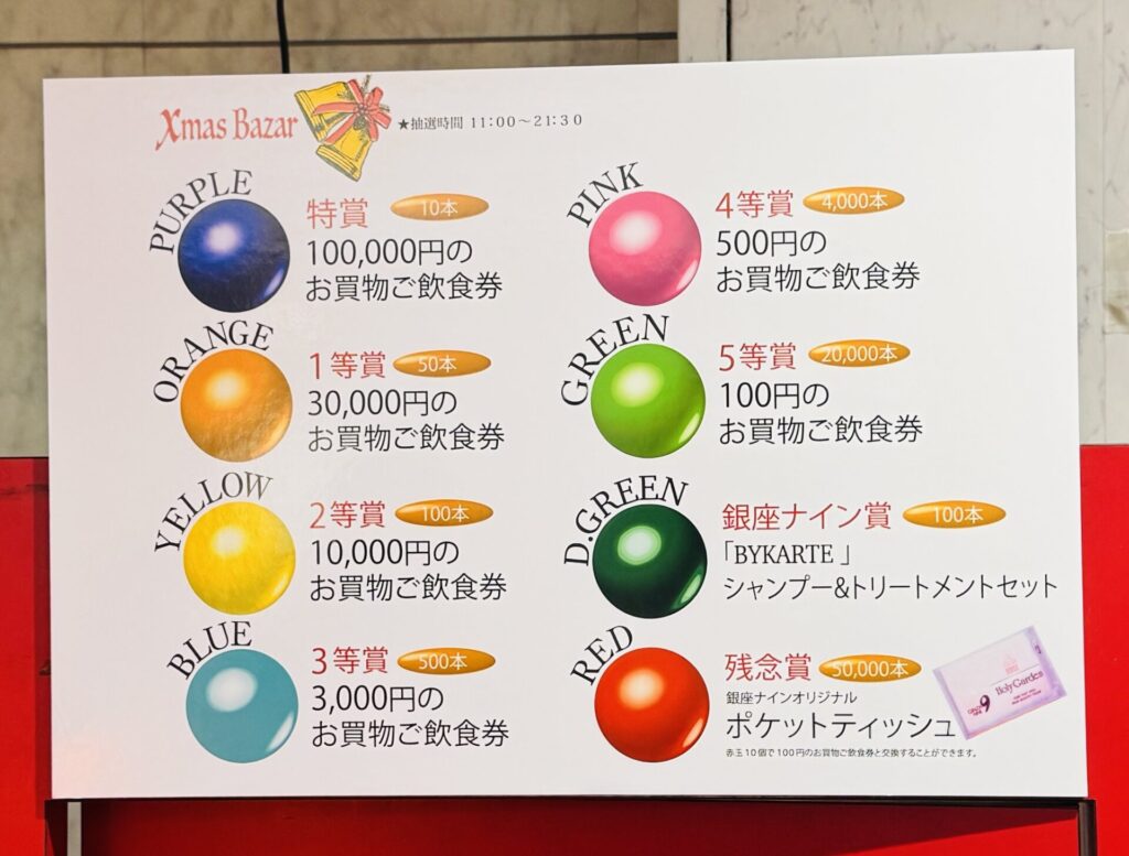 目当てはクリスマスバザールの抽選会。手元には、銀座ナインでの買い物でもらった抽選券が7枚ある。会場は、抽選を待つ列で想像以上にぎわっていた。