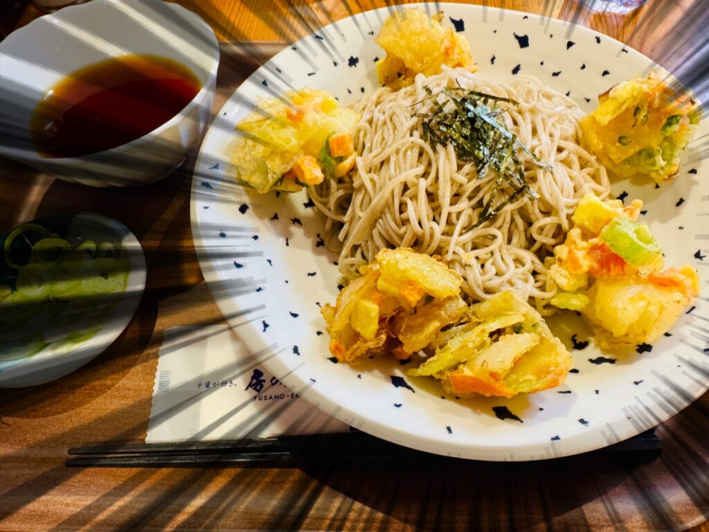 かつて東銀座で長年親しまれ、惜しまれつつ姿を消した「歌舞伎そば」。その名物だった、そばの上にかき揚げを豪快に散らしたスタイルと、目の前の「大見得そば」が重なる。かき揚げはお皿に整然と乗るのではなく、あえて崩した状態でそばの上へ。これが見た目にも食感にも独特のリズムを生み出している。