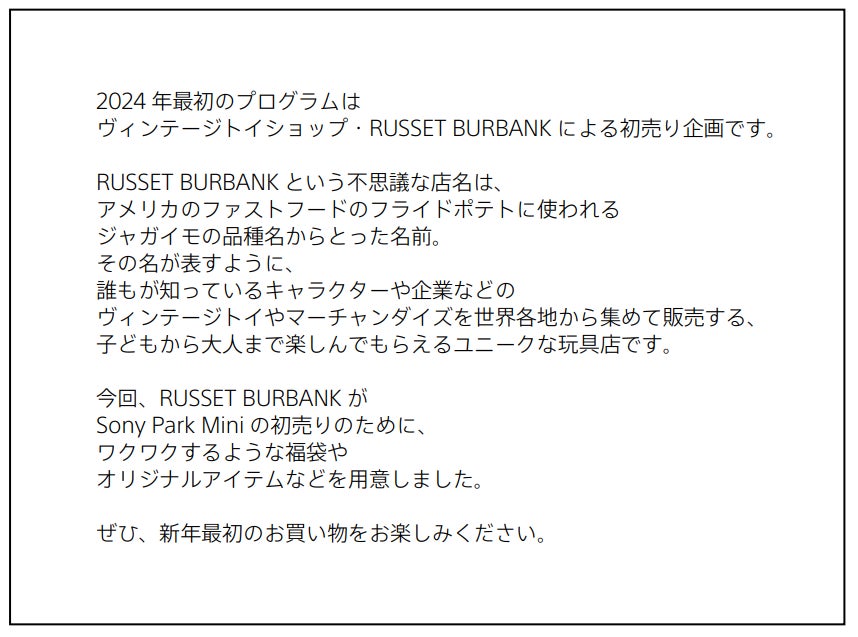 第3弾は、新年の銀座の風物詩でもある「初売り」がテーマ。東京・幡ヶ谷にあるヴィンテージトイショップ「RUSSET BURBANK」とコラボレーションし、2024年1月5日(金)~14日(日)までの期間限定で「RUSSET BURBANK GINZA STORE NEW YEAR’S SALE」を開催します。毎年オンラインのみで販売をしているRUSSET BURBANKの年始恒例企画の福袋を、今回はじめてリアル販売。Sony Park Miniのためにセレクトしたお得な「Mini福袋」として数量限定で販売します。ほかにも、誰もが知っている様々なキャラクターのヴィンテージトイや先行販売となるオリジナルアイテムが並びます。まるで“ おもちゃ箱” のようなSony Park Miniで、いつもと違う新年初のお買い物をお楽しみください!