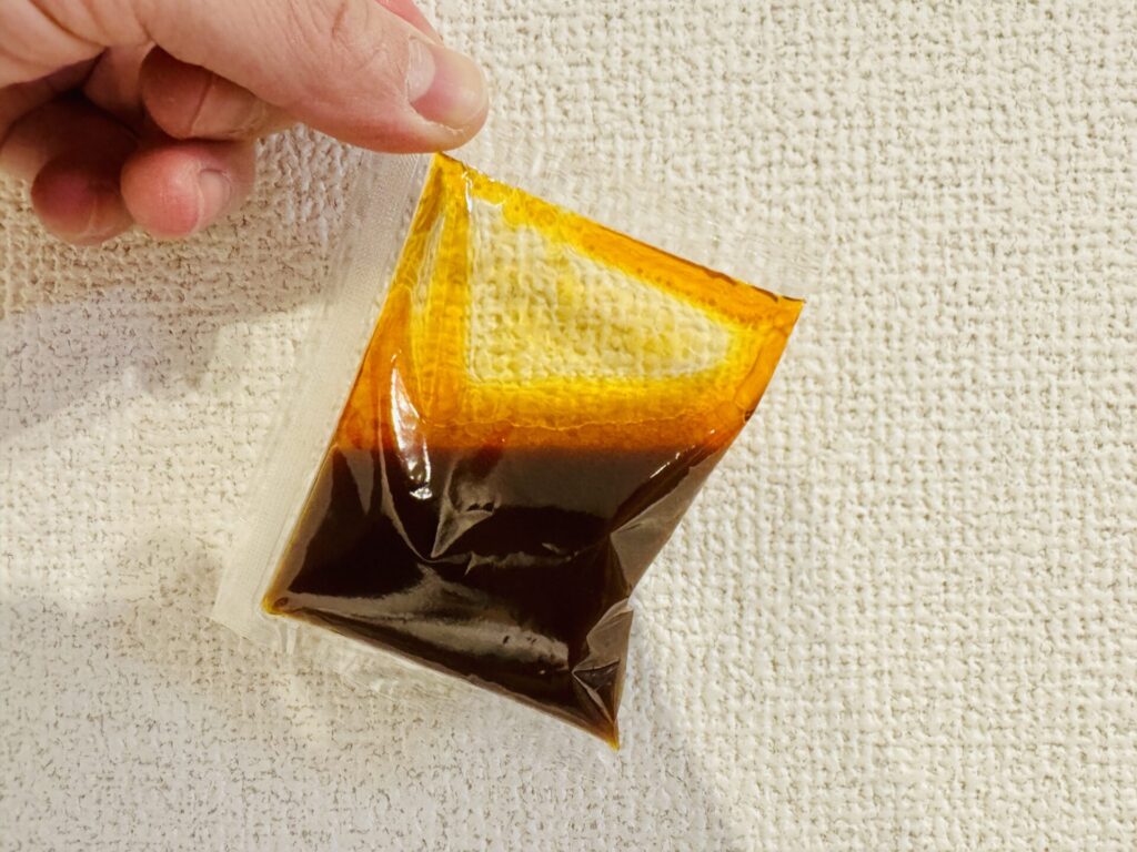 瓶ではない。気取った容器でもない。小さな透明の袋に入ったタレは、一見すると控えめ。だが、この袋こそが天龍通をうならせる。店内では出されない、持ち帰り専用。わざわざ家で食べることを選ぶ人がいるのも、このタレを知ってしまったからだ。