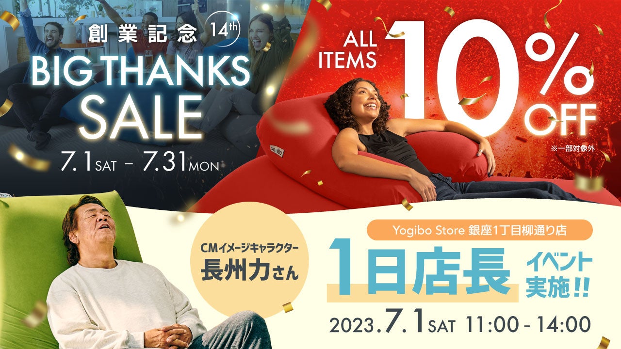 「快適すぎて動けなくなる魔法のソファ「Yogibo(ヨギボー)」は、2009年7月22日にアメリカ東海岸のニューハンプシャー州ナシュアで誕生したブランドです。全世界でYogiboを運営する株式会社Yogibo(代表:木村誠司/以下、「Yogibo」)は、来る2023年7月22日(土)にYogibo創業14周年を迎えることを記念し、お客様のご愛顧に感謝を込めて2023年7月1日(土)~7月31日(月)の期間中、全商品10%OFFの「Yogibo BIG THANKS SALE」を開催いたします。これに伴い、CMイメージキャラクターである長州力さんが銀座1丁目柳通り店の1日店長として、開店から2時間で売上100万円達成にチャレンジいたします。