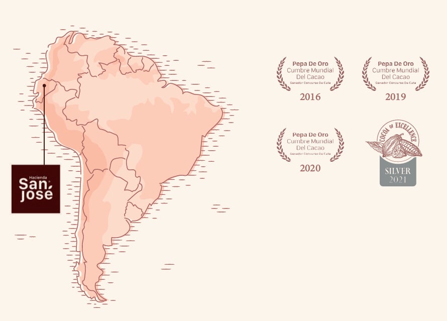 カカオは、ペパデオロ2016、2019、2020や、最高のチョコレートに贈られるゴールデンビーン賞など、数え切れないほどの賞を受賞しているエクアドルのハシエンダ サンホセ産を使用。