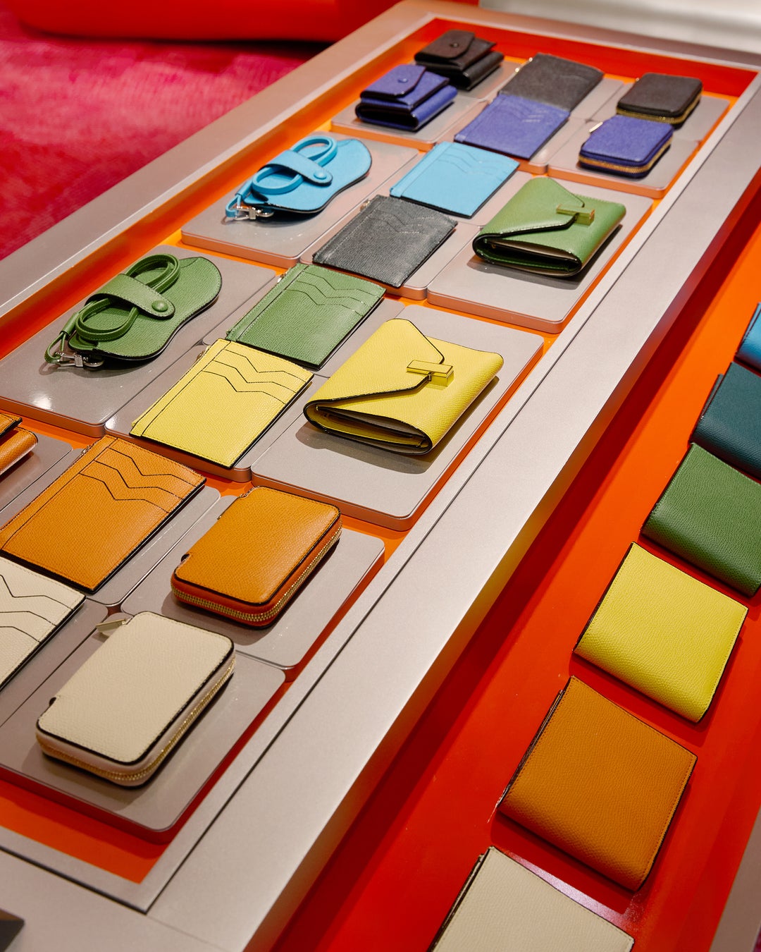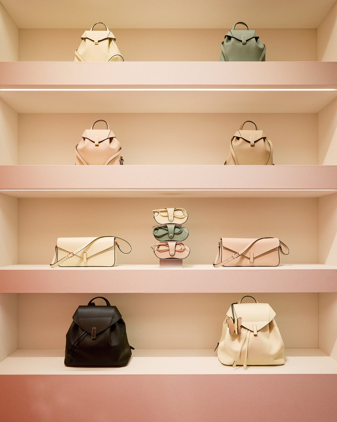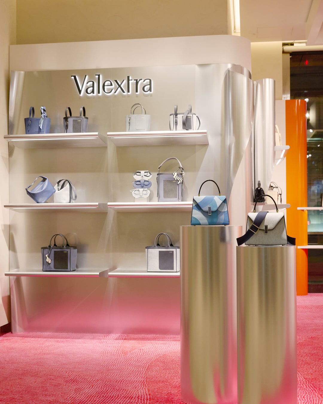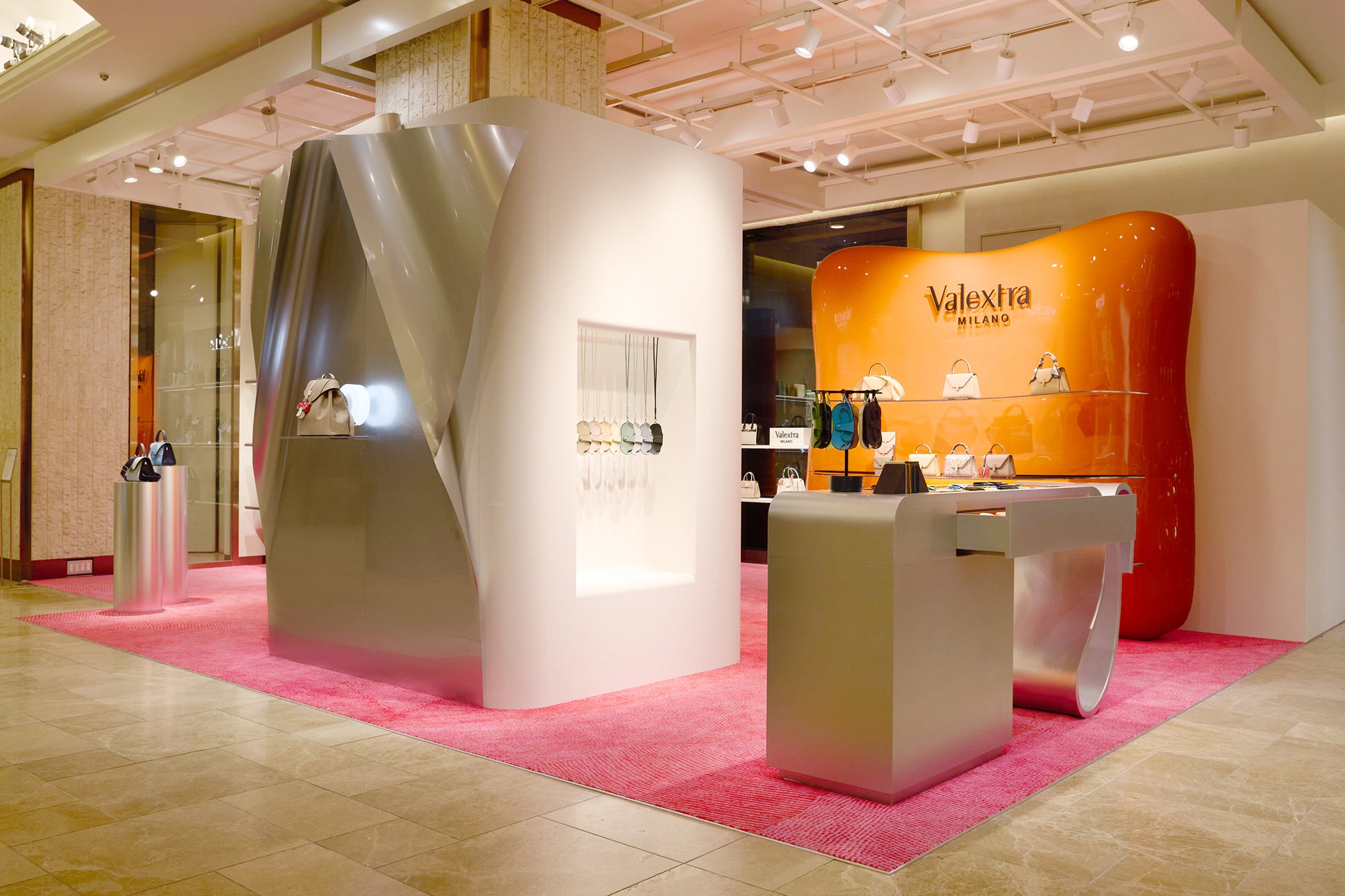 1週間の期間限定でオープンするPOP UP STOREは、永続的で、調和の取れたデザインコンセプト。色鮮やかなピンクのカーペットに、バッグのしなやかさを表現したウェーブや丸みのあるオブジェをあしらい、ヴァレクストラのエレガントなレザーアイテムを引き立てています。