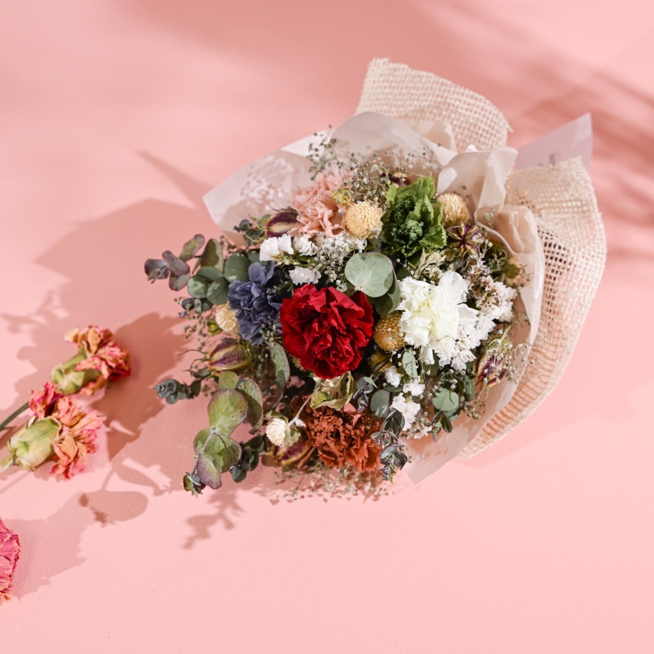 店頭でも大人気なドライフラワー花束Sに、プリザーブドカーネーションが入った母の日限定デザイン。