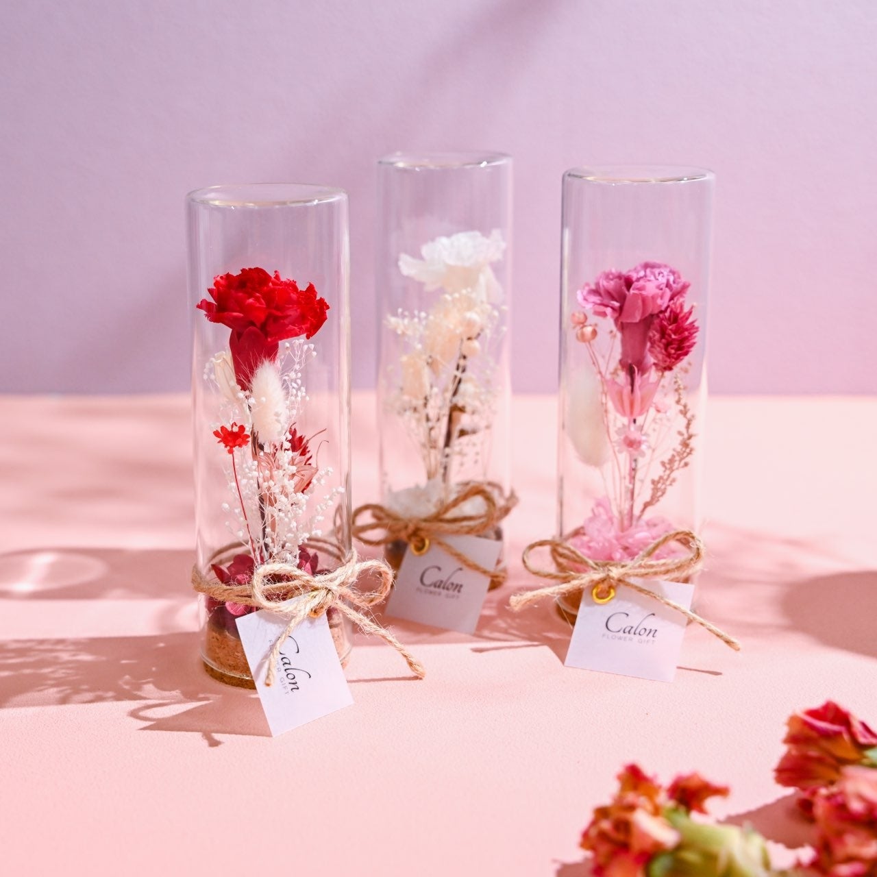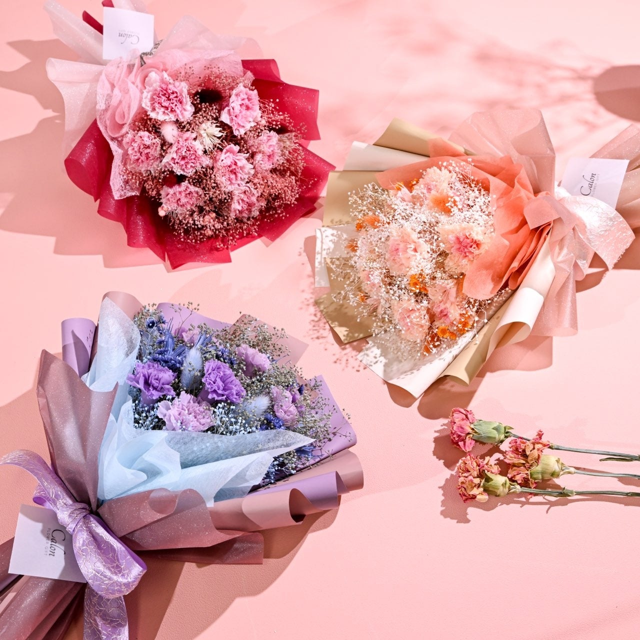 今年の母の日は5月14日(日)。お母様への感謝の気持ちを伝えるギフトとして、Calon DRY FLOWERでは『枯れないカーネーション』を使用したフラワーギフトをご用意いたします。