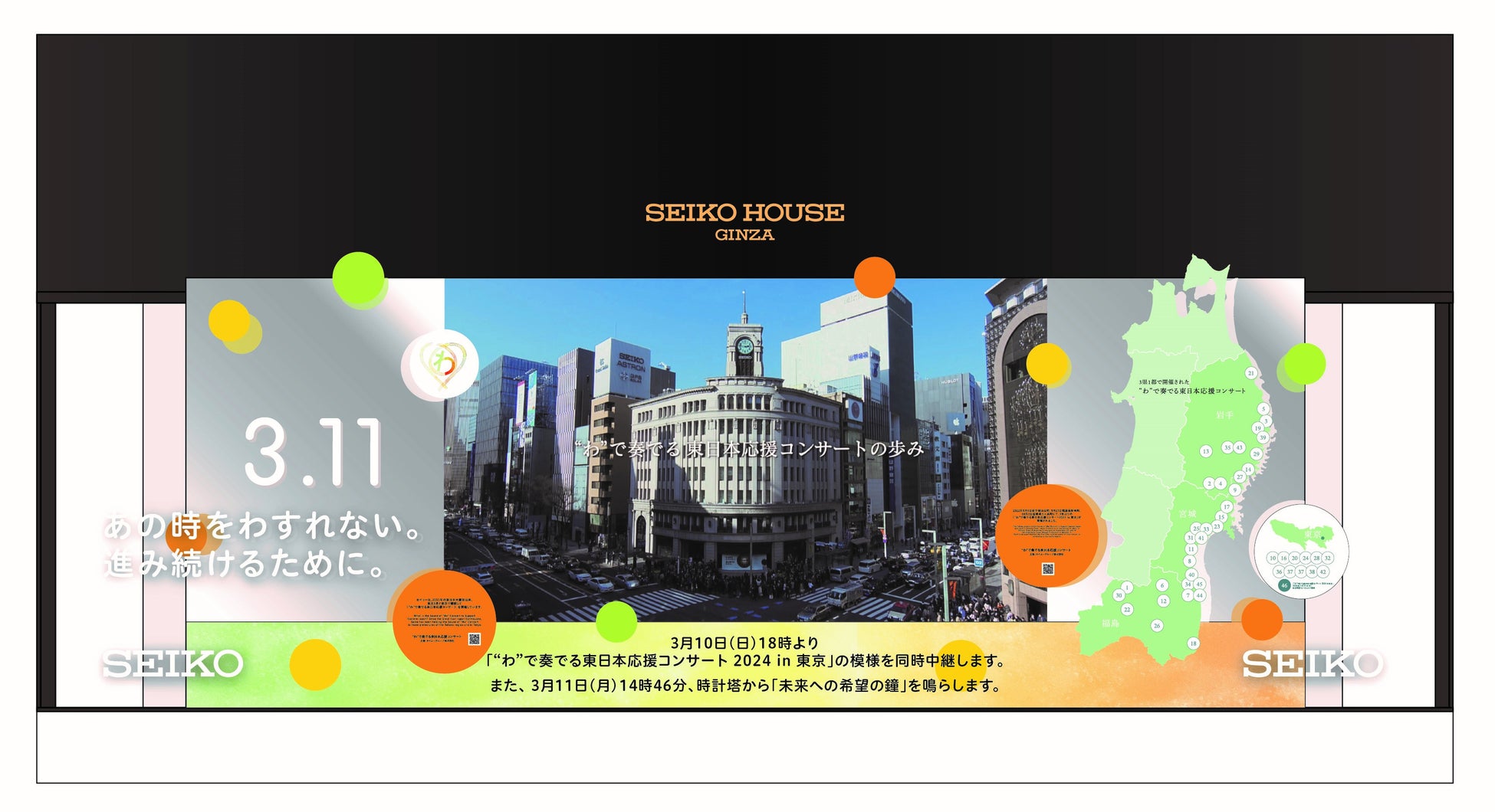 また、3月4日(月)~11日(月)の期間、SEIKO HOUSE GINZAのショーウインドウでは、セイコーが東北の被災3県および東京で開催している「“わ”で奏でる東日本応援コンサート」の活動を紹介する動画を上映します。動画では、2011年の東日本大震災の発生直後から昨年秋までの12年間に通算45回開催された「“わ”で奏でる東日本応援コンサート」の様子を、出演アーティストのコメントとともにハイライトで振り返りかえる。