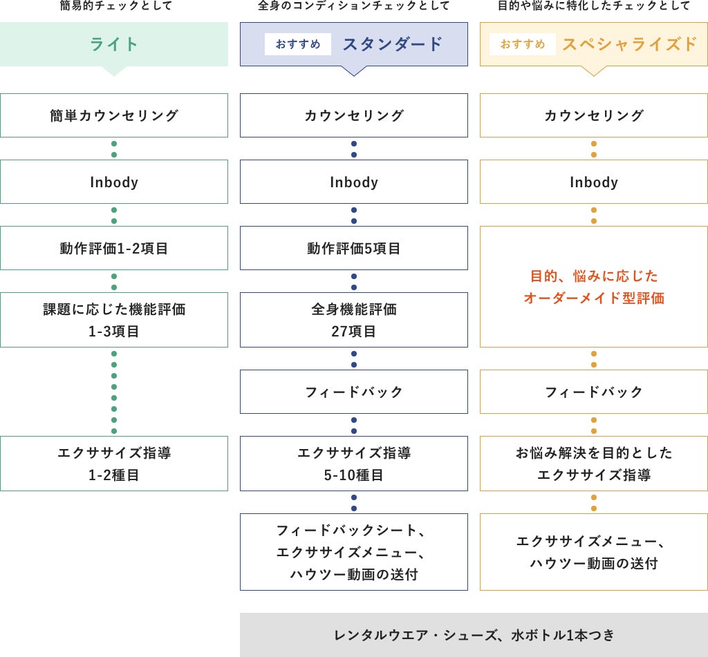 全身のコンディションチェックには「スタンダード」(100 分22,000 円)、痛みの改善や競技力強化など目的に合わせて深掘りするなら「スペシャライズド」(70 分18,700 円)、すき間時間に簡易チェックをするなら「ライト」(30 分5,500 円)を。3 か月から半年に1 度、効果の確認とエクササイズメニューのアップデートを行うのがおすすめです。