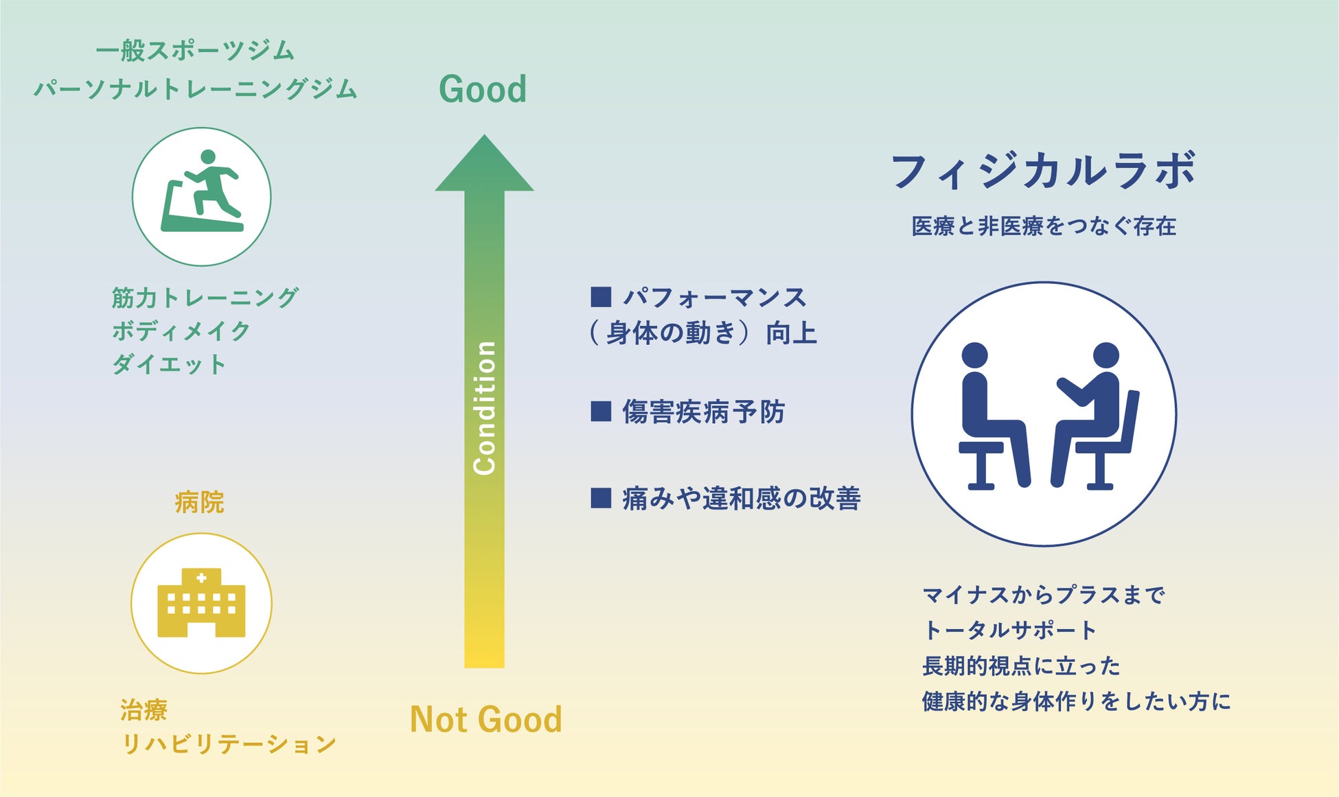 パーソナルジムというとダイエットやボディメイクの印象が強いですが、肉体の健康管理の専門家である私たちが目指すのは、見た目よりも機能のよさ。動きのいい肉体です。地味とも言えるこの姿勢を6 年超にわたり貫く中で、「痛めた膝を気にせず生涯サッカーを続けたい」「子供が小さいから体力をつけておきたい」「自分の脚で歩き続けたい」など、「したいこと」に向けた長期的視点での身体づくりを任せてくださるお客さまがいらっしゃるように。そこで、「人生を楽しむための身体づくり」という観点からサービスを見直して充実させることにしました。